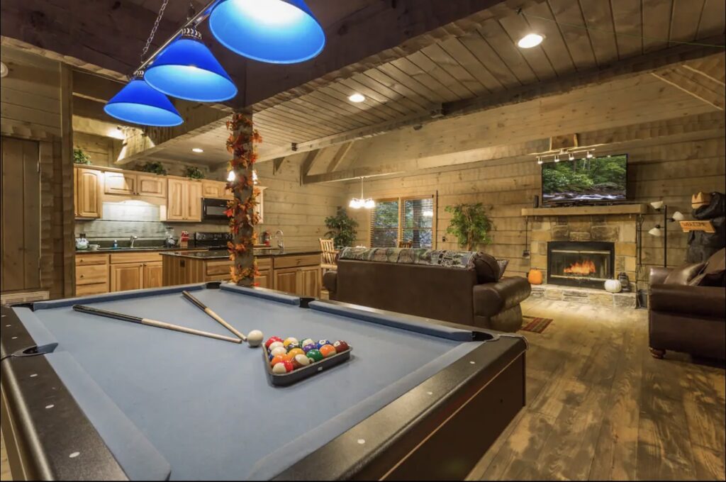 We have a stone wood fireplace that’s great for cozy evenings, a pool table for some friendly competition, and a hot tub on the wrap-around porch.